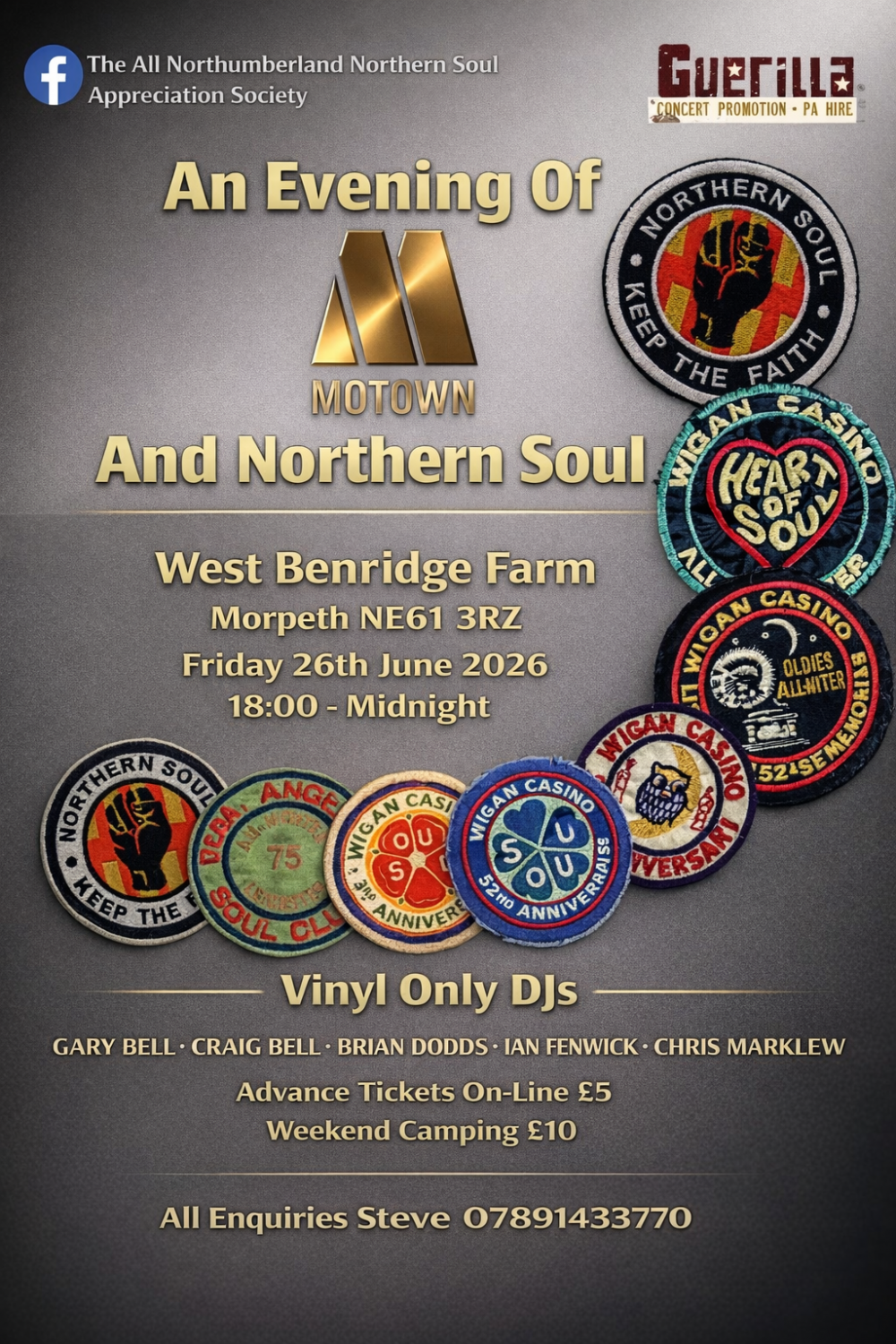 Back for its fourth year at West Benridge Farm, A Night of Northern Soul & Motown returns on Friday 26 June. Five DJs from the All Northumberland Northern Soul Appreciation Society spin classic Northern Soul, Motown hits and rare soul gems – all on vinyl. Custom barn dancefloor, bar and food. 6pm ’til late. £5 advance or on the door. Weekend camping £10.